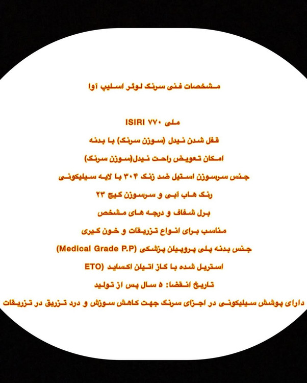 برل شفاف و درجه های مشخص. امکان تعویض راحت نیدل(سوزن سرنگ). مناسب برای انواع تزریقات و خون گیری. استریل شده با گاز اتیلن اکساید (ETO).